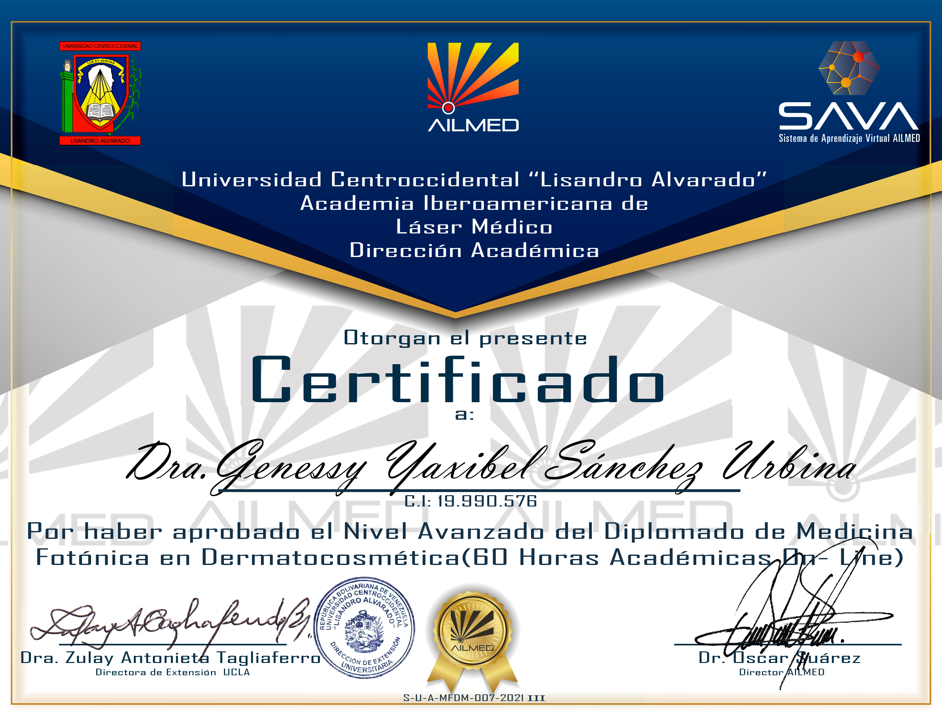 Cohorte VIII- Nivel Avanzado- Diplomado de Medicina Fotónica en Dermatocosmética - Dra.Genessy Yaxibel Sánchez Urbina