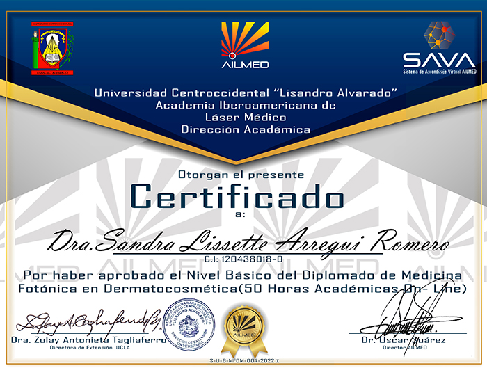 Cohorte IX- Nivel Básico- Diplomado de Medicina Fotónica en Dermatocosmética - Dra.Sandra Lissette Arregui Romero
