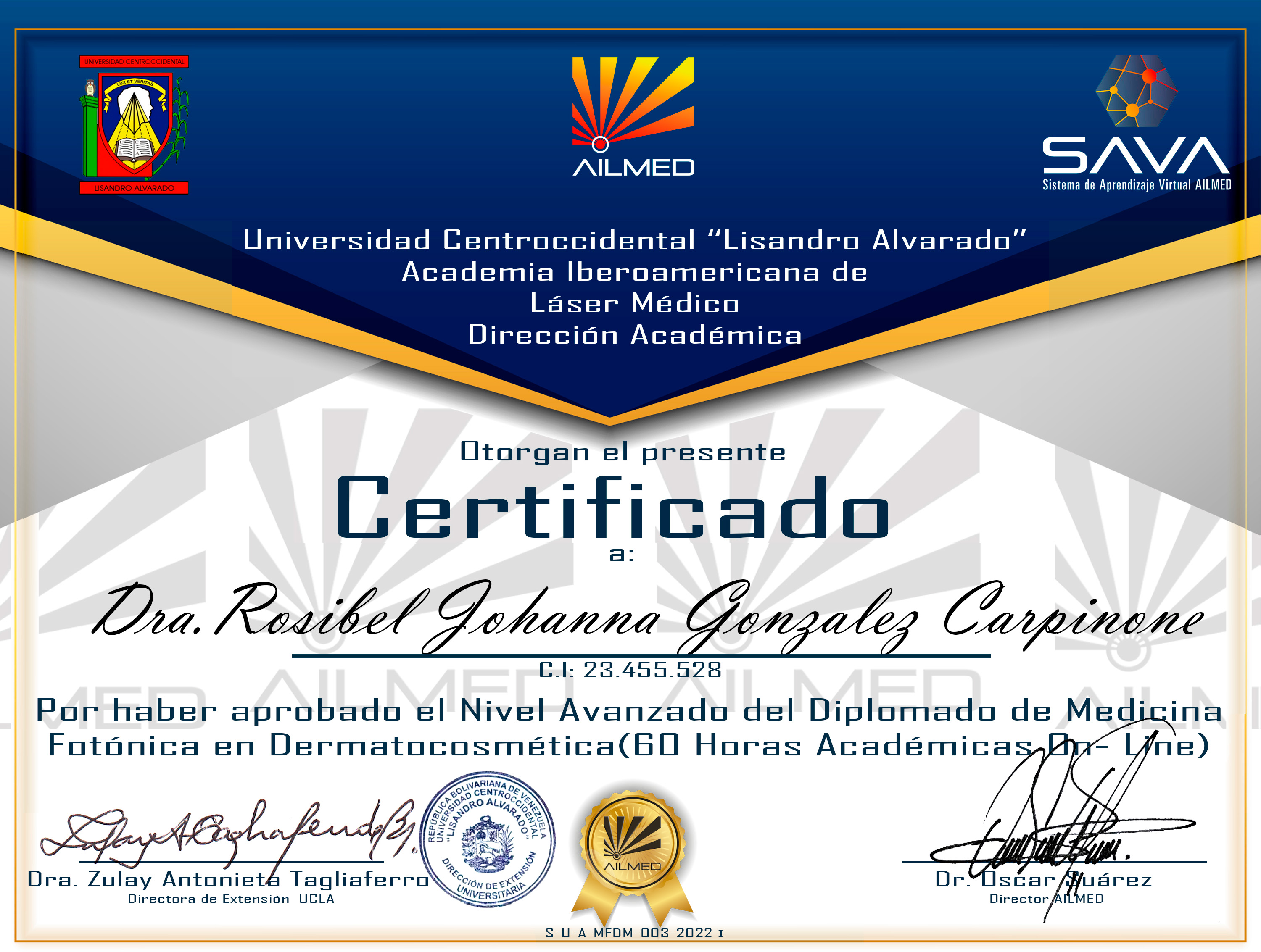 Cohorte VIII- Nivel Avanzado- Diplomado de Medicina Fotónica en Dermatocosmética - Dra.Marielidany Paola Rosales Urdaneta